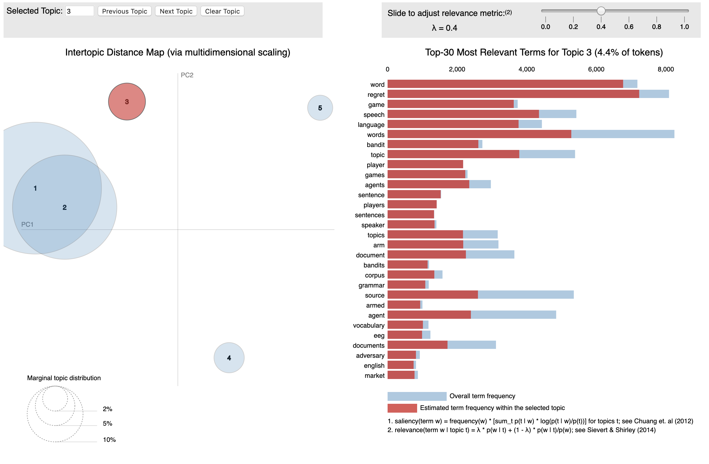 For (1), you can manually select each topic to view its top most frequent and/or “relevant” terms, using different values of the λ parameter. This can help when you’re trying to assign a human interpretable name or “meaning” to each topic.